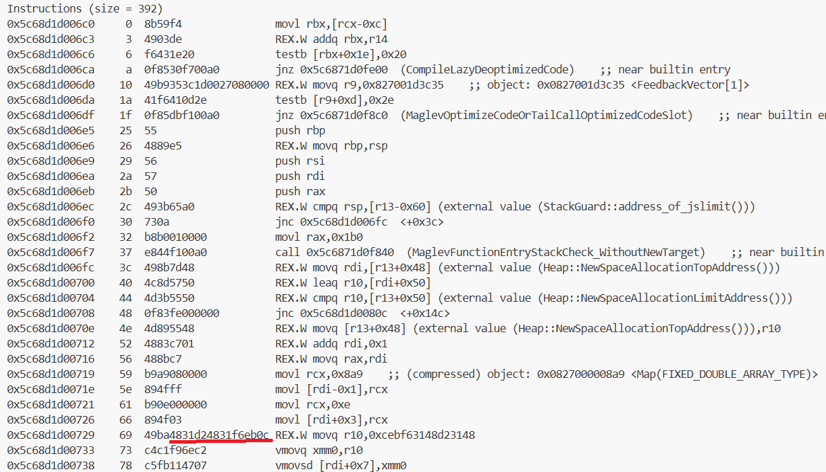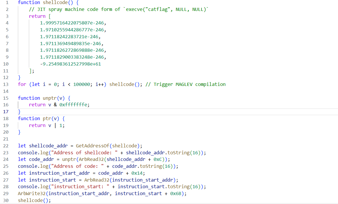 for (let i = 0; i < 100000; i++) shellcode(); 将shellcode()执行100000次,触发MAGLEV编译,编译器会将生成的code写入RWX段中(在沙箱外,但指向code的指针在沙箱内部,因此可以访问)