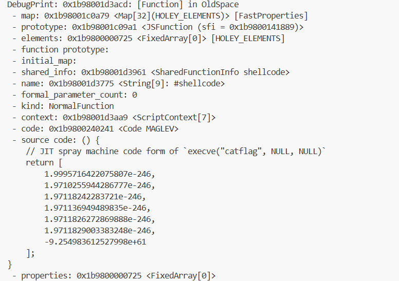 此时观察到shellcode函数的地址为0x1b98001d3acd,code的地址为0x1b9800240241,但此时请注意,由于v8引擎的函数地址会默认8字节对齐,所以后三位默认是全0,因此对区别不同函数没有帮助,可用来作为标记使用(标记是函数还是smi,1为函数,0为smi),因此0x1b98001d3acd是末位加一之后的结果,因此实际地址为0x1b98001d3acc