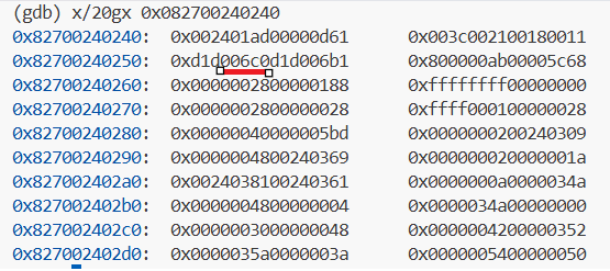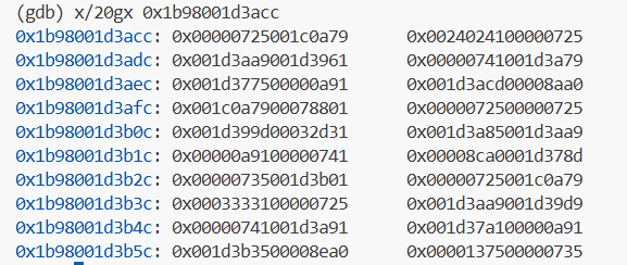 x/20gx 这一GDB命令为查看某地址开始的20个双字的值